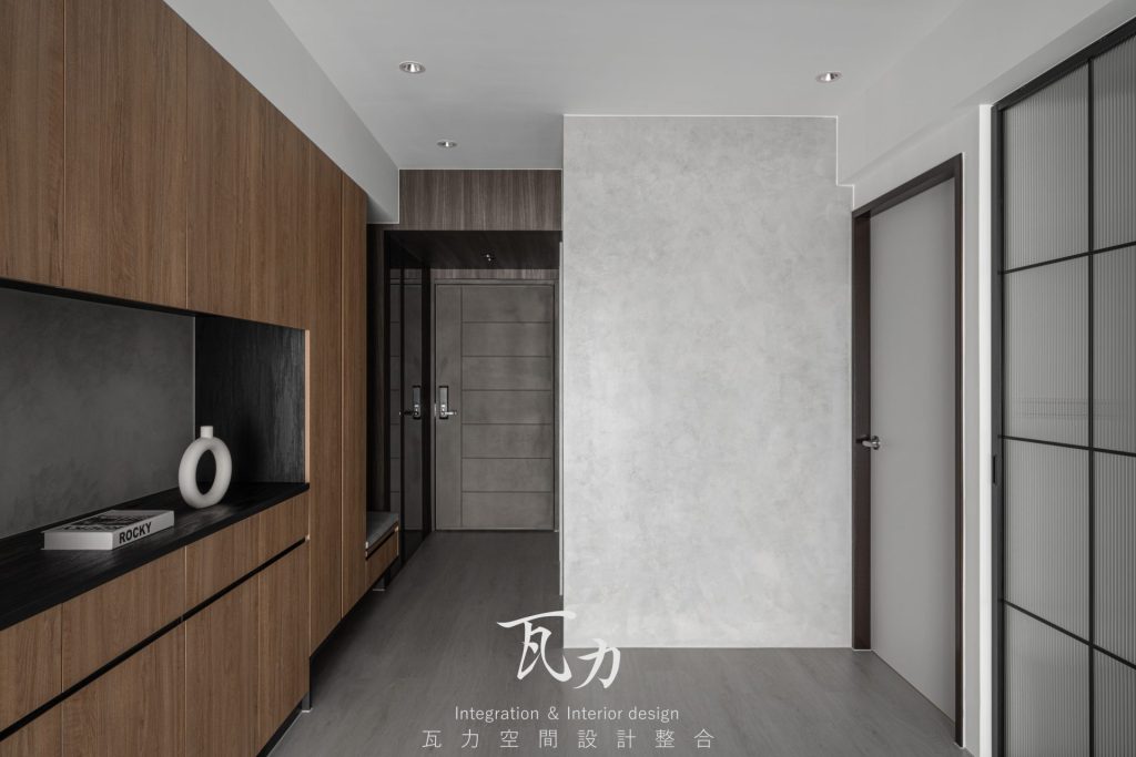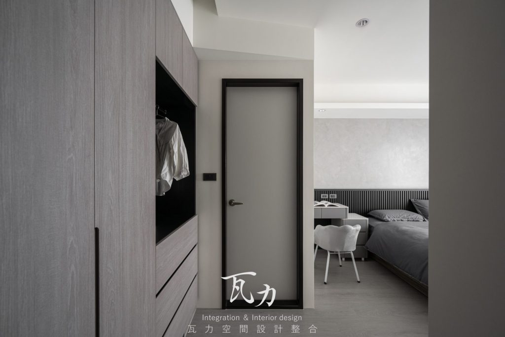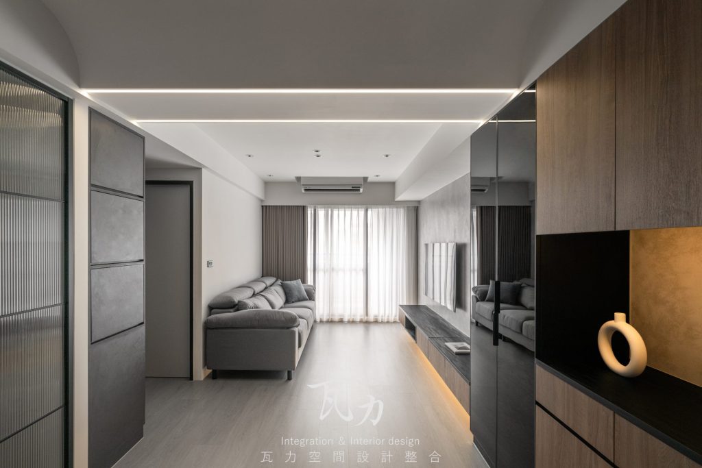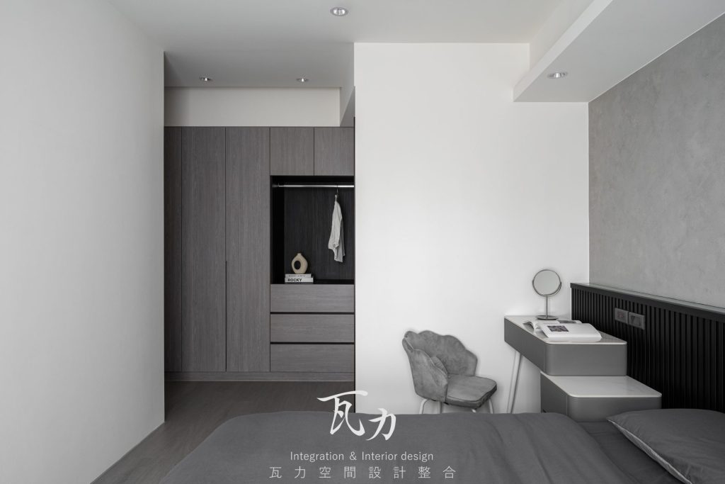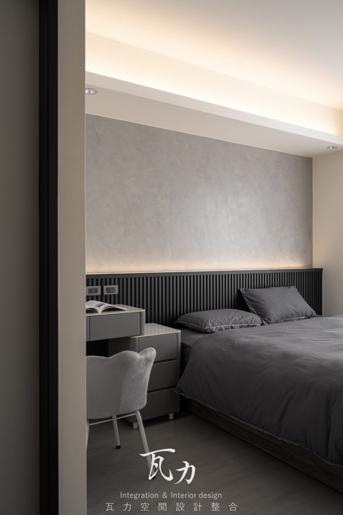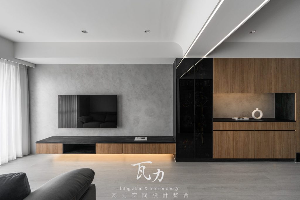 整體空間以灰色為主色調,搭配木質和黑色烤漆元素,營造出冷靜而富有質感的氛圍。灰色水泥質感牆面與淺灰色木質地板完美融合,增添了現代感與舒適感。燈光設計注重層次感,天花板內嵌LED燈帶,隱藏式照明提升了空間的氛圍感。設計中大量採用隱藏式收納櫃,保持了空間的整潔和實用性。整體設計強調簡約而不失高雅,為居住者創造出一個溫馨舒適的生活環境。