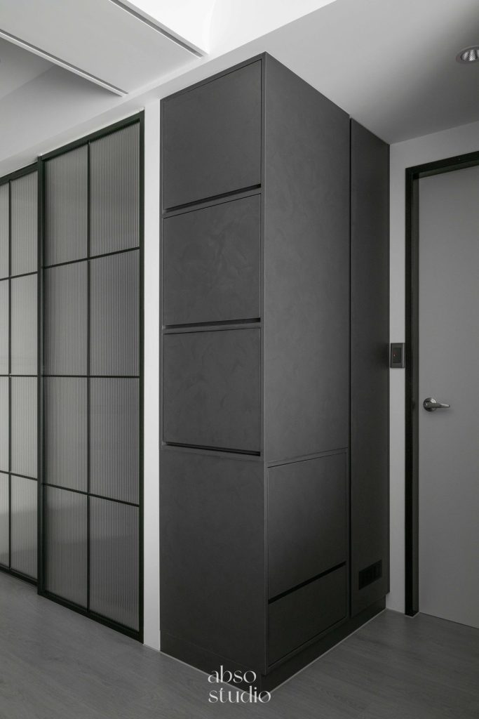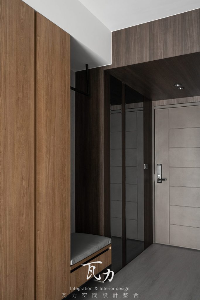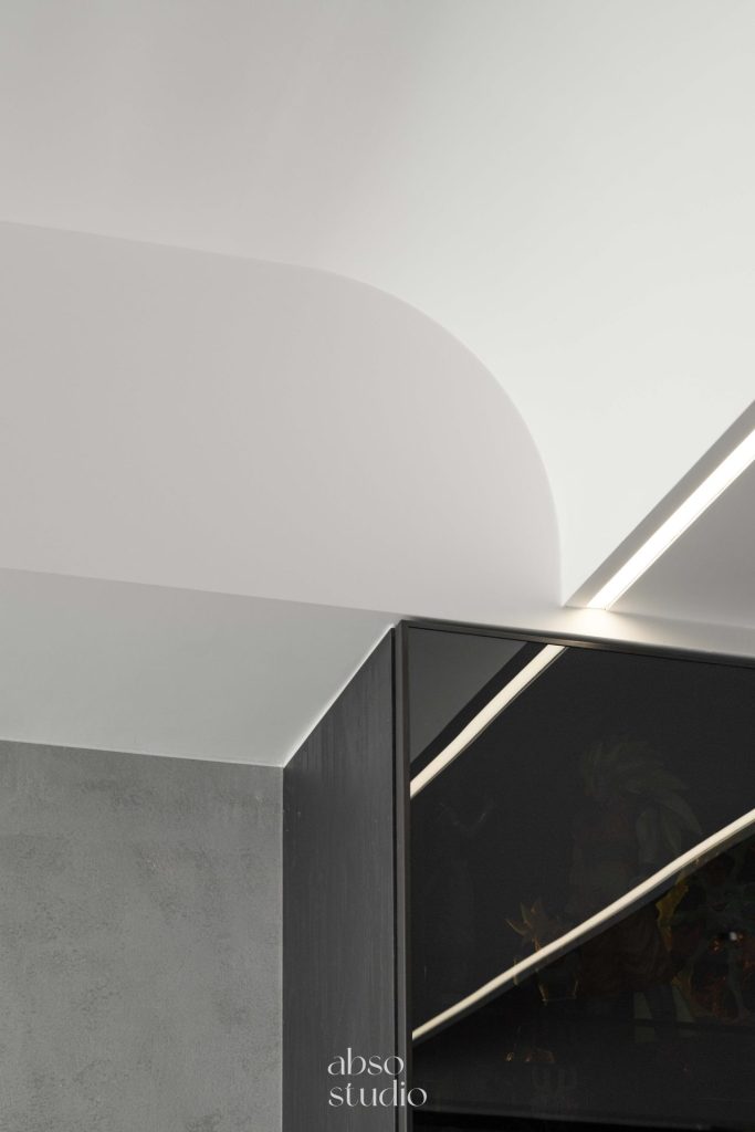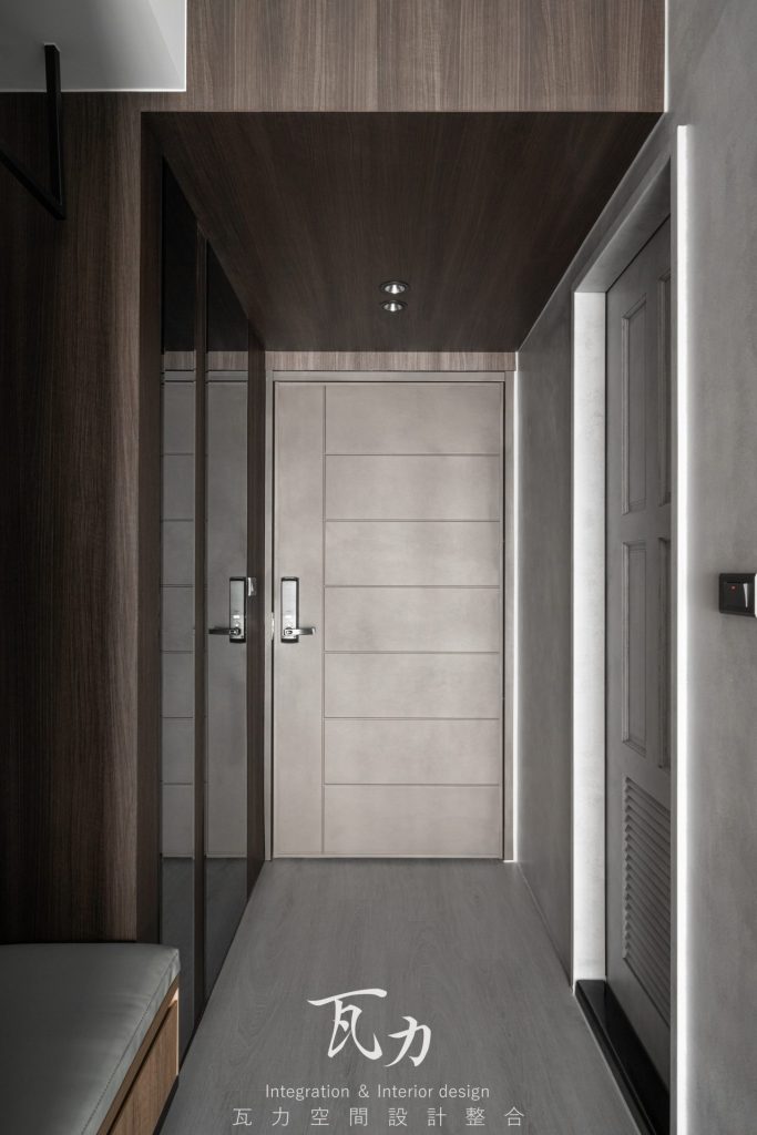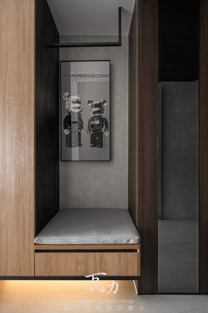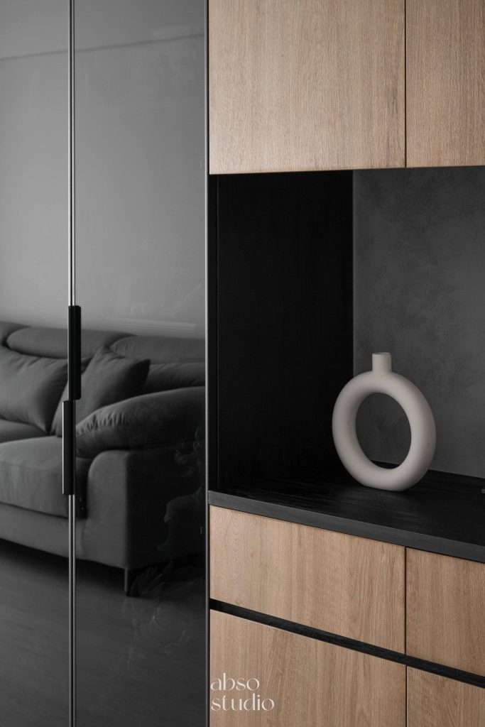 整體空間以灰色為主色調,搭配木質和黑色烤漆元素,營造出冷靜而富有質感的氛圍。灰色水泥質感牆面與淺灰色木質地板完美融合,增添了現代感與舒適感。燈光設計注重層次感,天花板內嵌LED燈帶,隱藏式照明提升了空間的氛圍感。設計中大量採用隱藏式收納櫃,保持了空間的整潔和實用性。整體設計強調簡約而不失高雅,為居住者創造出一個溫馨舒適的生活環境。