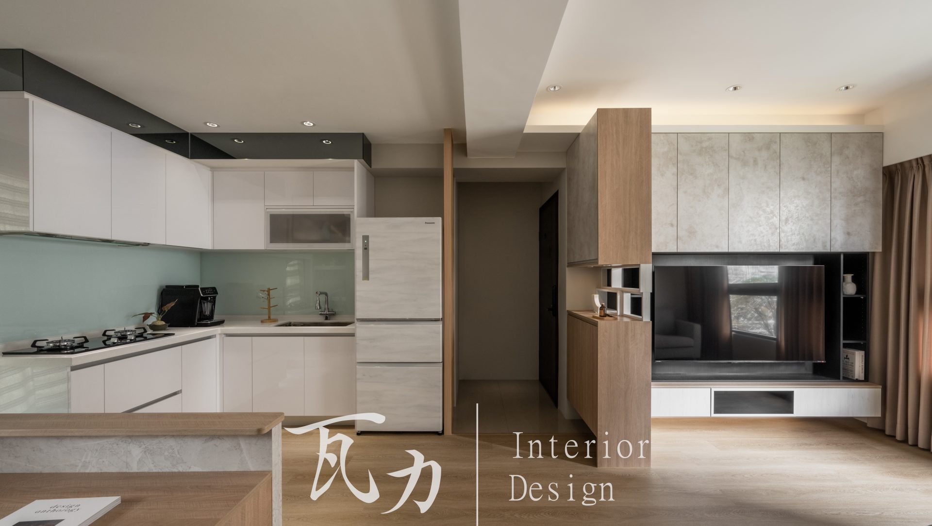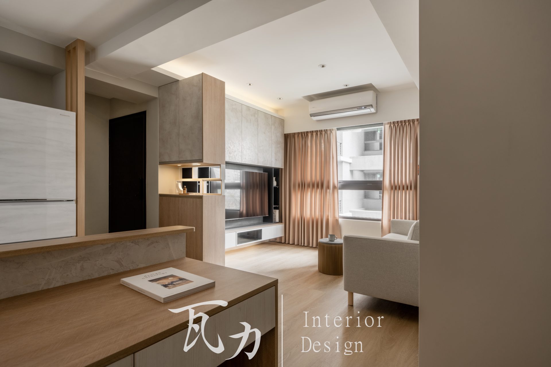 該設計採用開放式空間佈局,將客廳、餐廳和廚房連接在一起,增加通透感和寬敞感。大面積窗戶引入自然光,搭配淺色窗簾,營造柔和舒適的氛圍。設計選用淺色木材和中性色調,創造出溫暖放鬆的環境。功能性設計體現於電視牆儲物空間和廚房櫃體,兼具美觀和實用性。細節處的裝飾品增添了生活氣息和個性化元素,展現出現代風格的宜居空間。